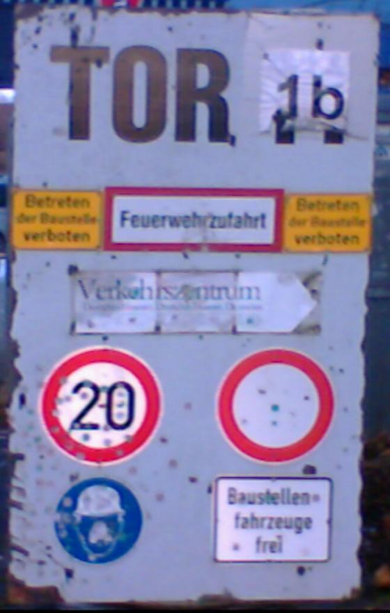Foto: Original-Warnschild am Eingang zum Abbruchgelände mit Durchfahrt zum nicht mehr offiziell angemieteten, aber gerne genutzten Fujitsu-Mitarbeiter-Parkplatz, zum KittyCatClub und zu Europas größter Künstlerkolonie (zumindest bis Mai/Juni? 2009...) |